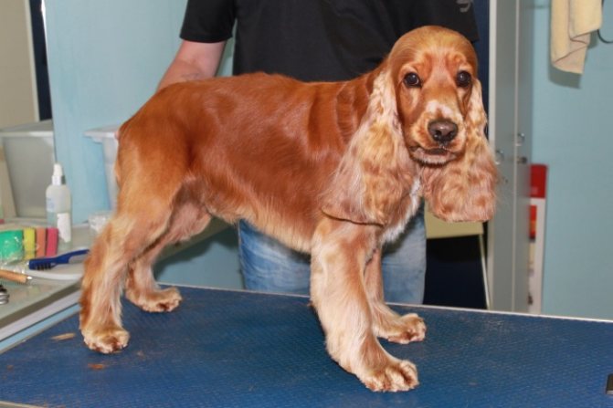 Английский спаниель, как и подобает охотнику, одет более практично. Украшающие очесы тоже есть, но не столь густые и длинные. Стрижка делается таким образом, чтобы собака выглядела как можно естественней.