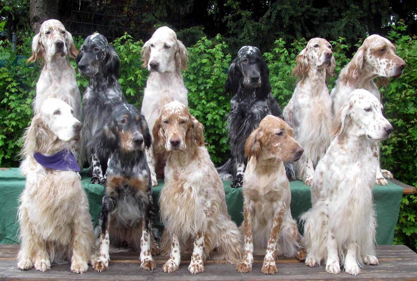 Порода выделяется достаточно большим разнообразием расцветок. Сеттер пятнистый всегда. Окрас может быть одно-, двух- или трёхцветным. В первом случае речь идёт о стальных или белых сеттерах, но в соответствии со стандартом крапчатость должна присутствовать на лапах. Сеттер черно-белый и коричнево-крапчатый особенно часто встречаются в питомниках.