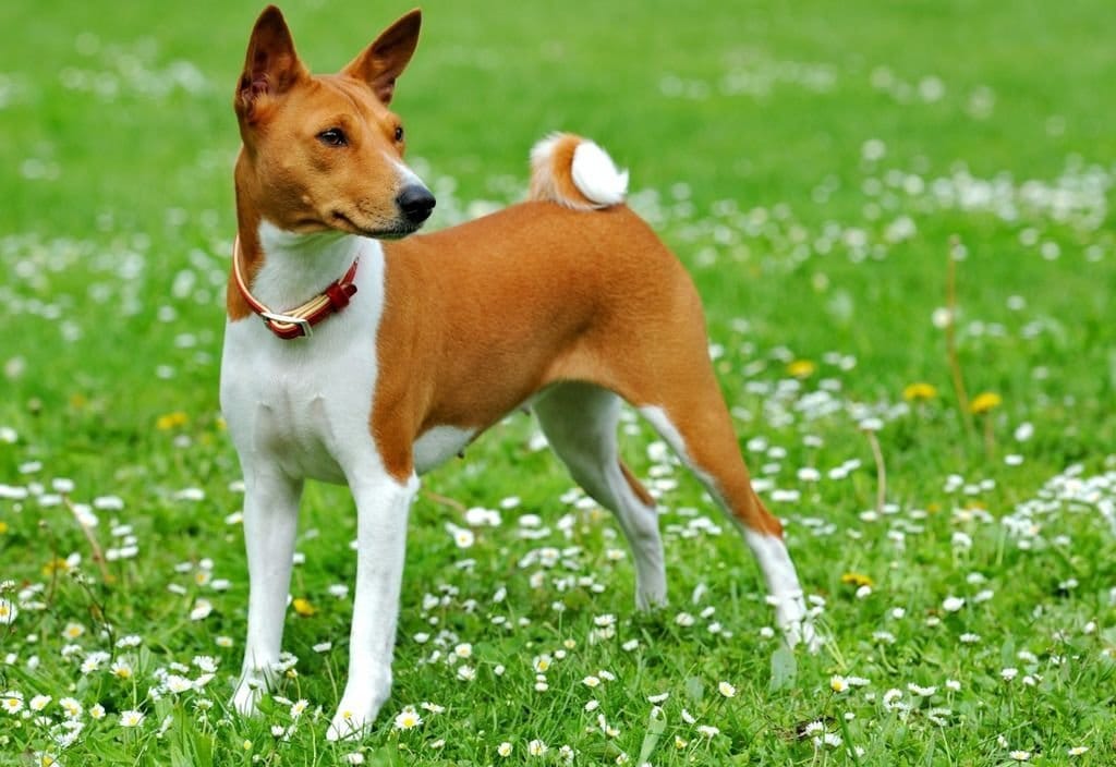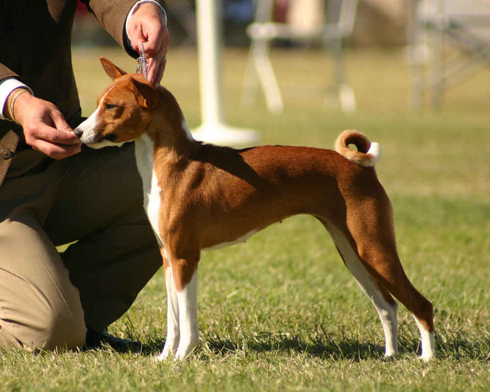 Вне зависимости от цвета шерсти обязательно наличие белоснежных лап, груди и кончика хвоста. Особенностью представителей данной породы является появление морщин в лобной области при сведении ушей. Также для басенджи характерен закрученный хвост. На фото ниже можно увидеть, как выглядит типичный представитель данной породы.